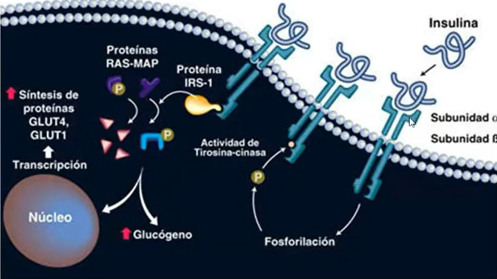 Quando a insulina se liga ao seu receptor nas cel periféricas promove a autofosforilição desse receptor. A partir dai há a atividade tirosina cinase nesse receptor, que, então, age sobre as proteínas de substrato de receptor para insulina-1 (IRS-1), a qual sinaliza ao núcleo a necessidade da transcrição de recptores de glicose (GLUT) tipo 1 e 4, que irão à membrana