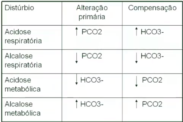Como o pH depende diretamente da relação bicarbonato/pCO2, a resposta compensatória bisa manter essa relação o mais próximo do normal ⇒ um indica a fonte primária da alterção e o outro os esforços do corpo para compensar