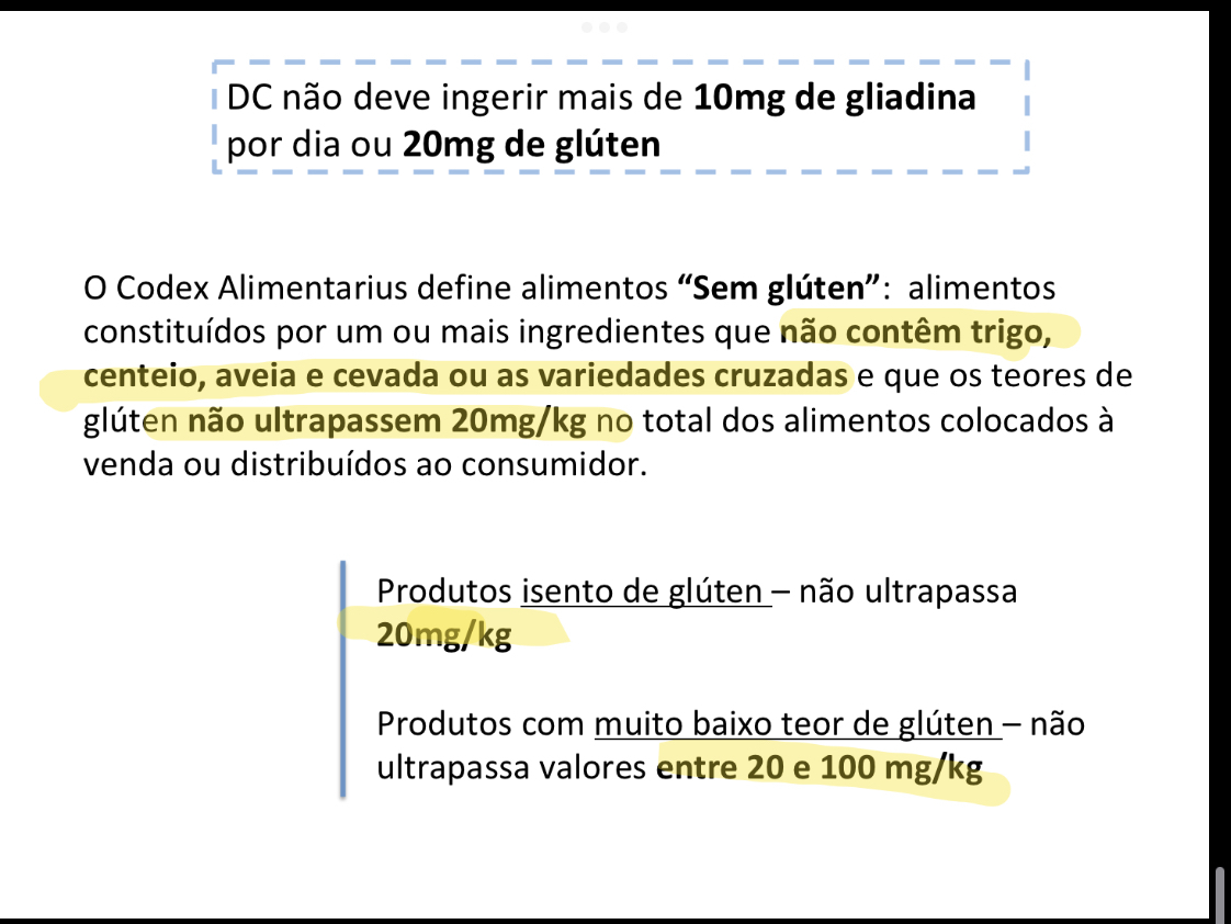 A códex define alimentos sem glutem alimentos que não contém ………. E os teores de ….. não ultrapassaram os …….