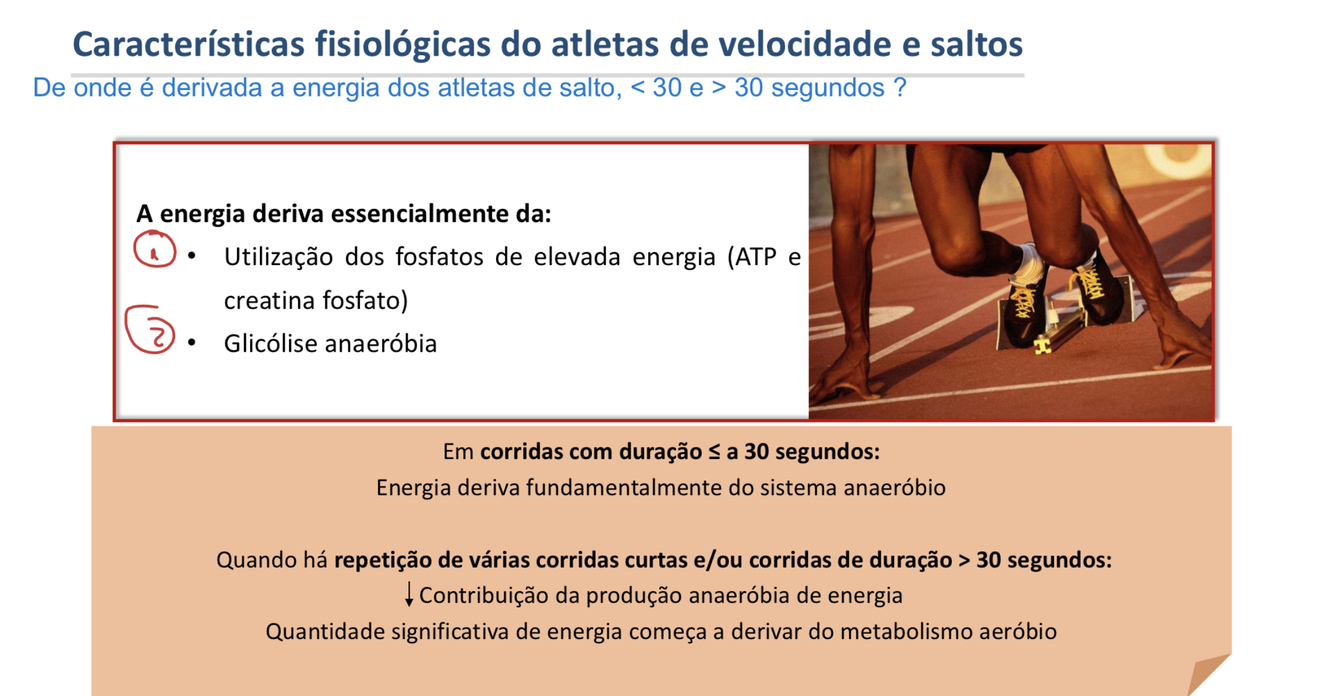De onde é derivada a energia dos atletas de salto, < 30 e > 30 segundos ?