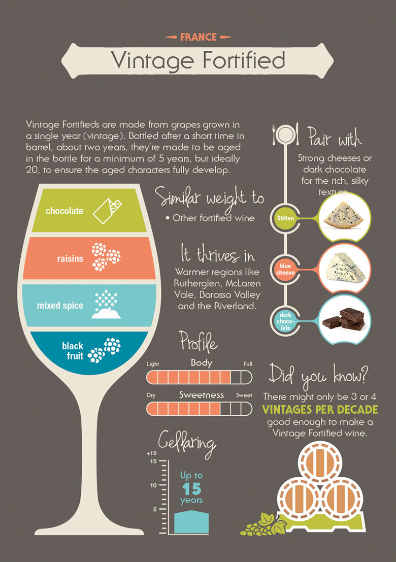 The most common grape variety used to make Vintage is Shiraz, with Touriga, Tempranillo and Mataro also featuring.