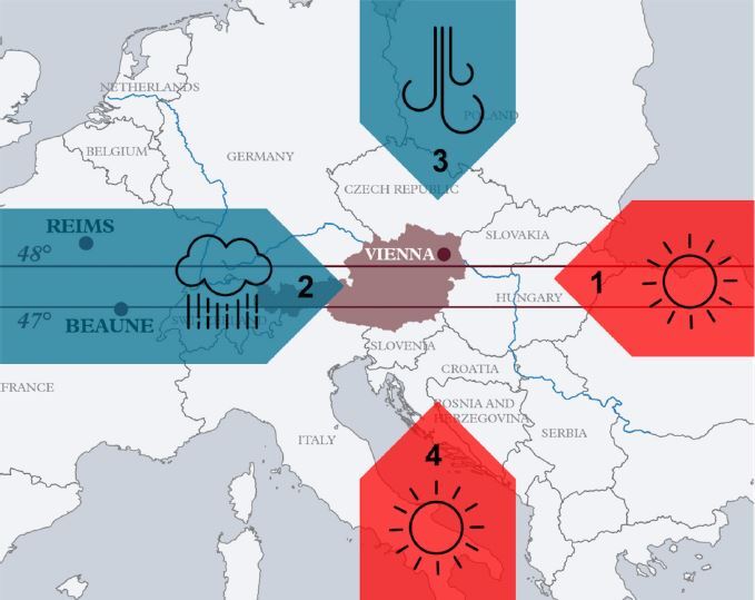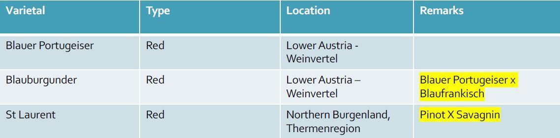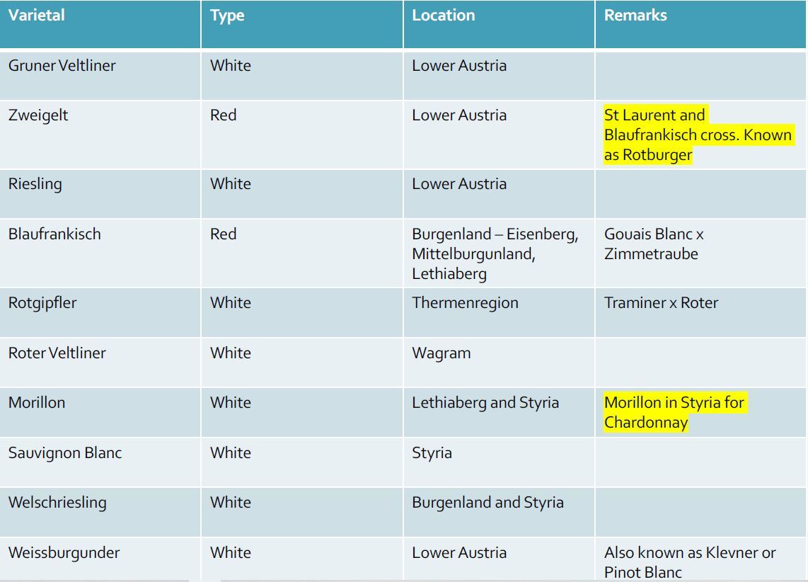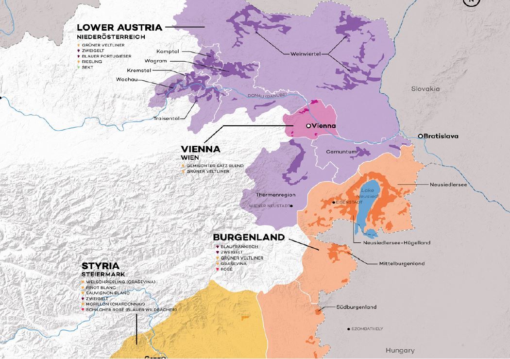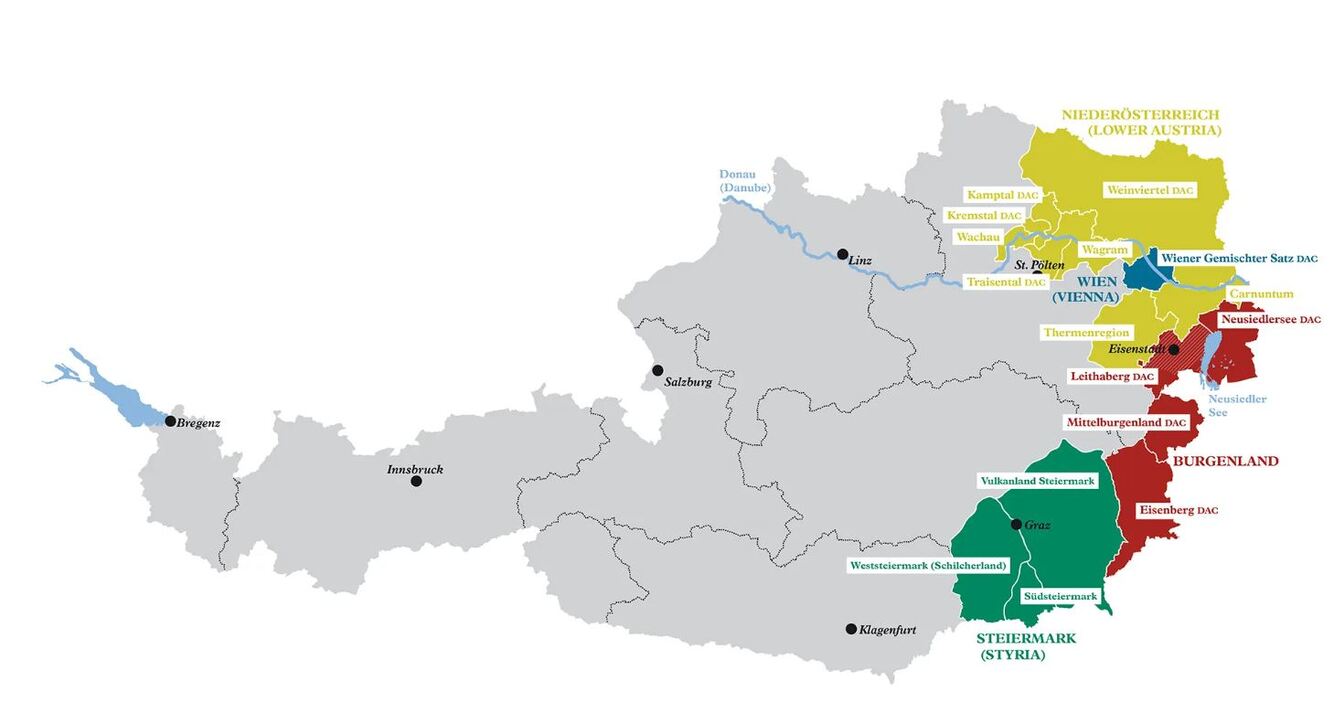 9 regions: Weinvertel,(Vienna North), Carnuntum, Thermenregion and Wiener Gemischter Satz (Vienna South), Kamptal, Kremstal, Wachau, Wagram, Traisental (Danube)