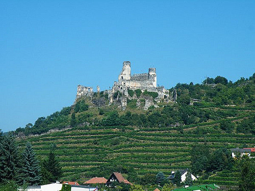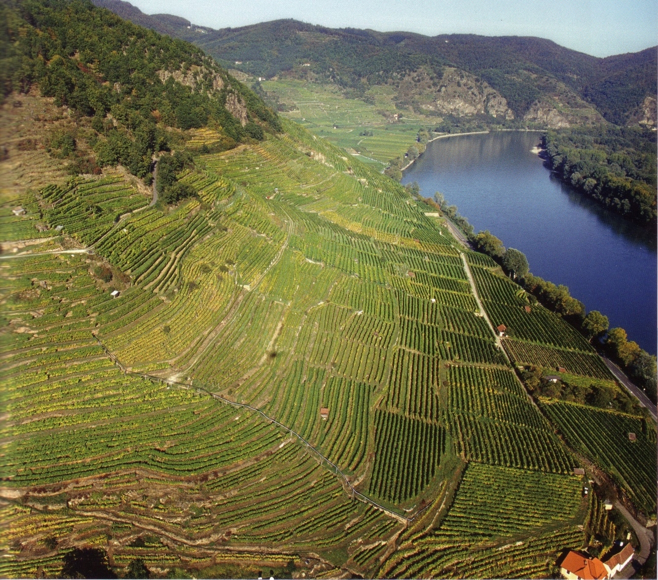At the top of Achleiten is forest, and at its base is the Danube. Vines enclosed by 12th-century stone walls run from the foot of the steep slope to about two-thirds of the way up. Viewed from the base, this vineyard’s slope is so steep that it seems to lean forward.