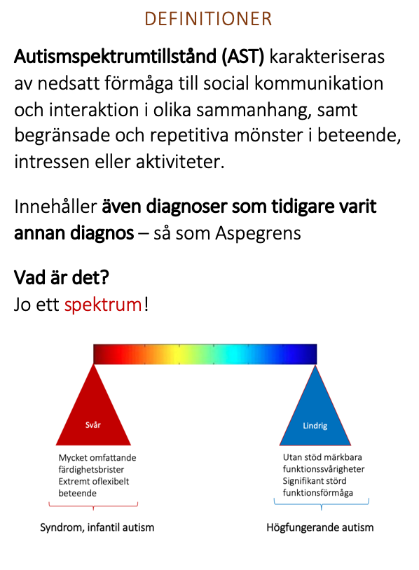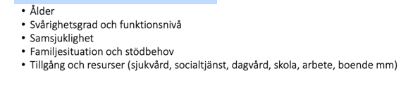 Anhörigintervjuer är viktiga, samt även funktionsbedömning med WISC för barn. Även: