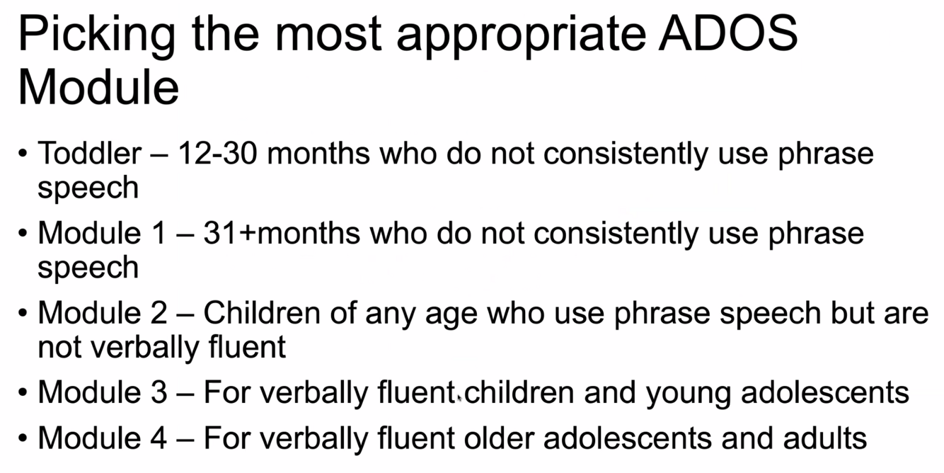 Which modules should be chosen for ADOS based on age and speech level