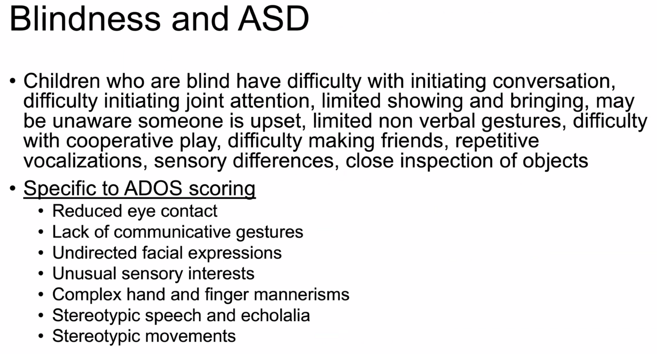 what aspects of ADOS would a blind child score high on unrelated to ASD?