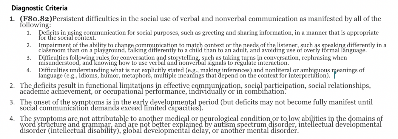 Features of social communication disorder (pragmatic)