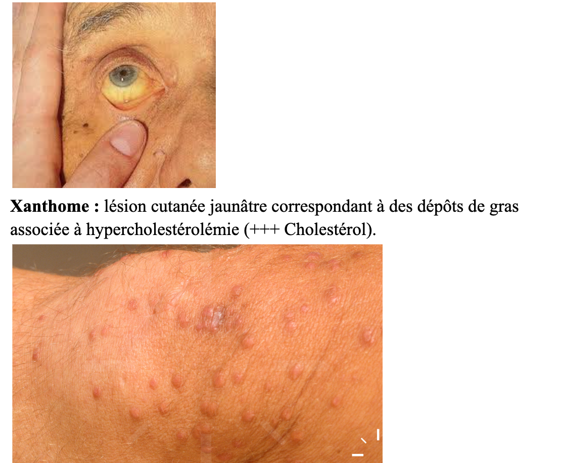 xanthome: dépot adipeux 2nd à l’hypercholestérolémie au niveau de la peau, donnant des lésions jaunatres