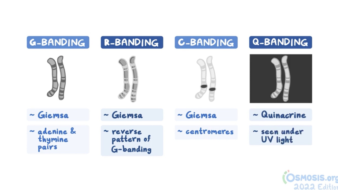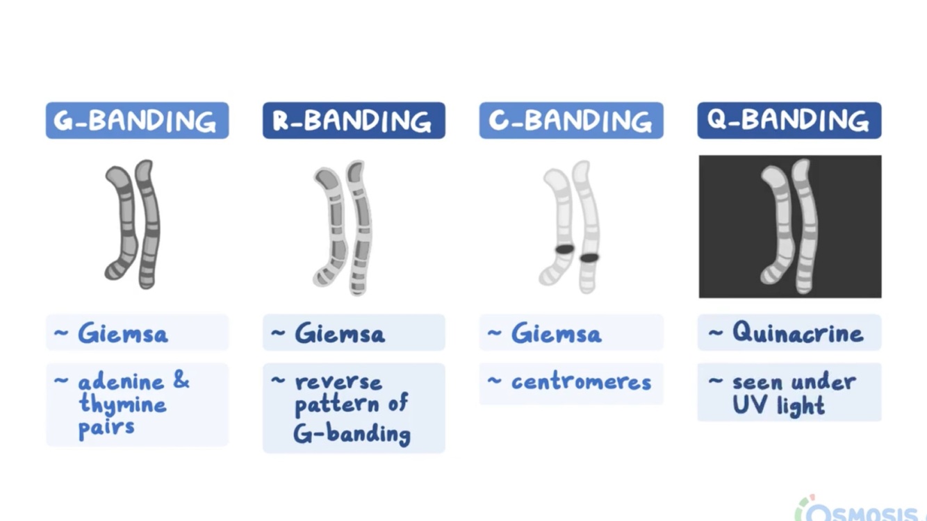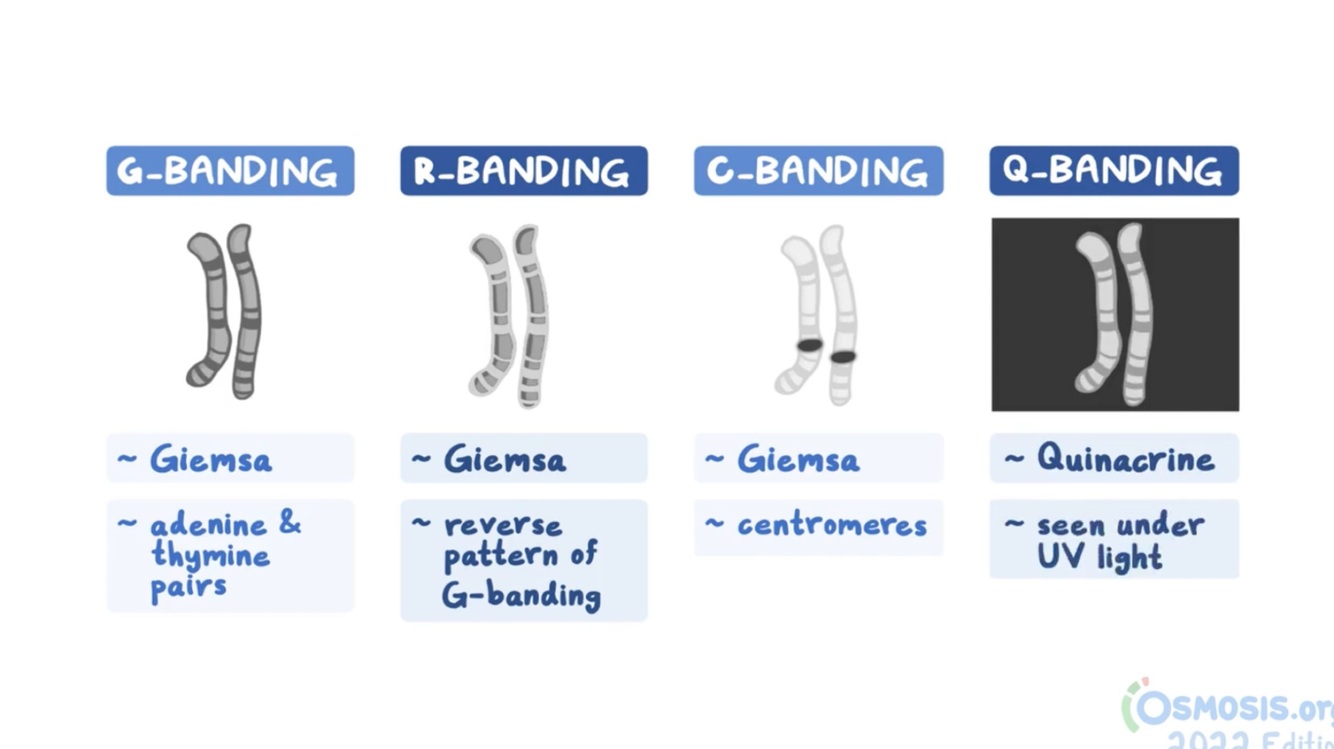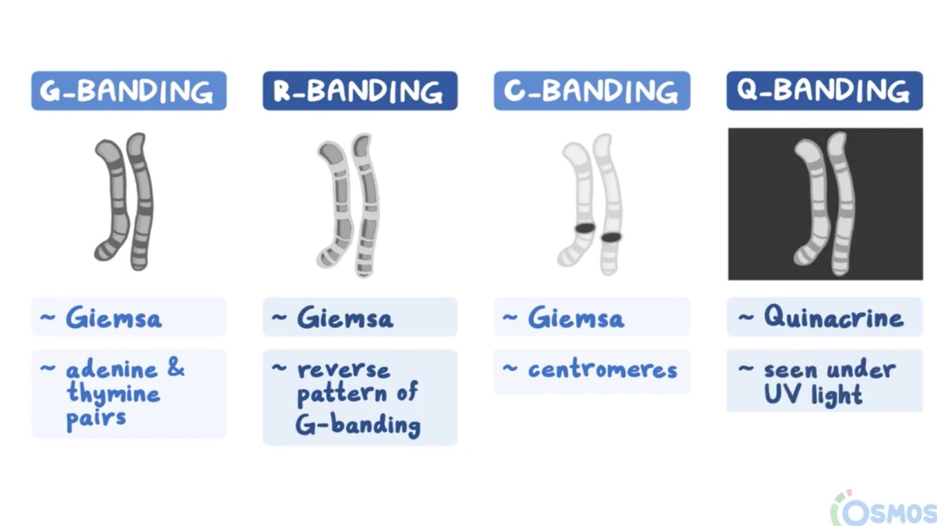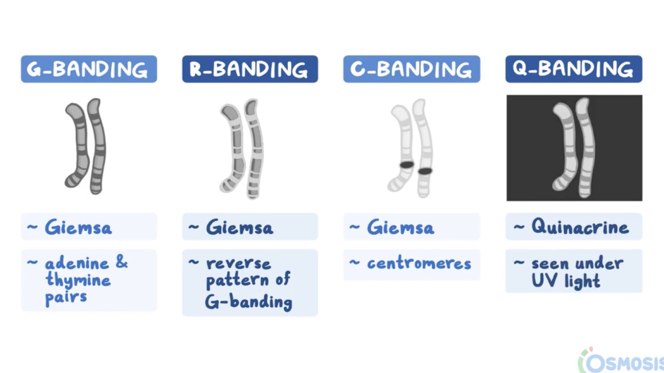 Cromosomas tratados con tripsina y tinción de Giemsa, donde las bandas claras se llaman bandas G negativas.