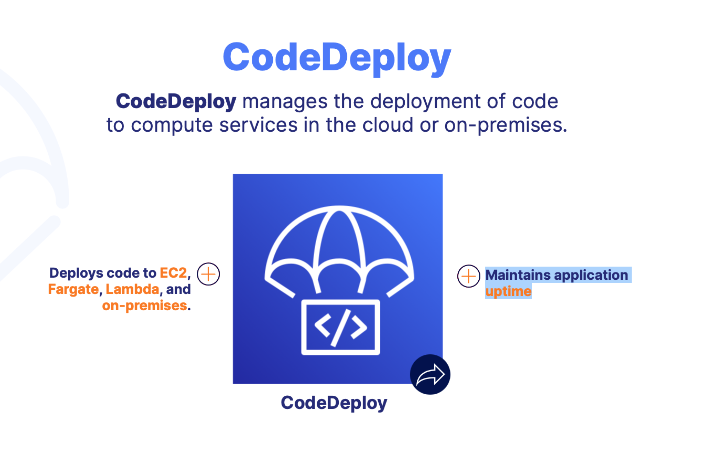 CodeDeploy manages the deployment of code to compute services in the cloud or on-premises.