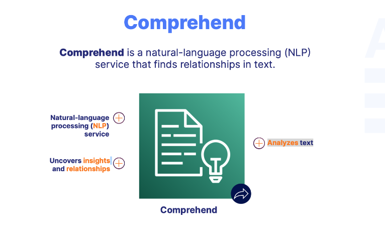 Comprehend is a natural-language processing (NLP) service that finds relationships in text.