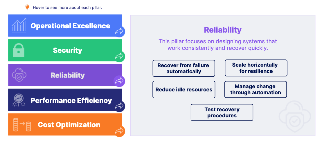 This pillar focuses on designing systems that work consistently and recover quickly.