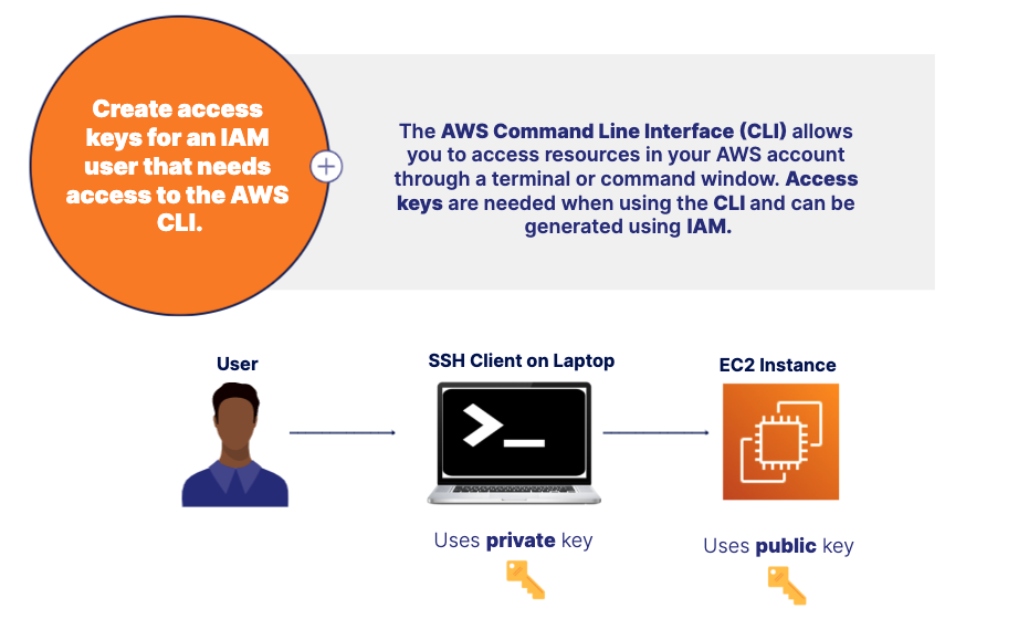 The AWS Command Line Interface (CLI) allows you to access resources in your AWS account through a terminal or command window. Access keys are needed when using the CLI and can be generated using IAM.