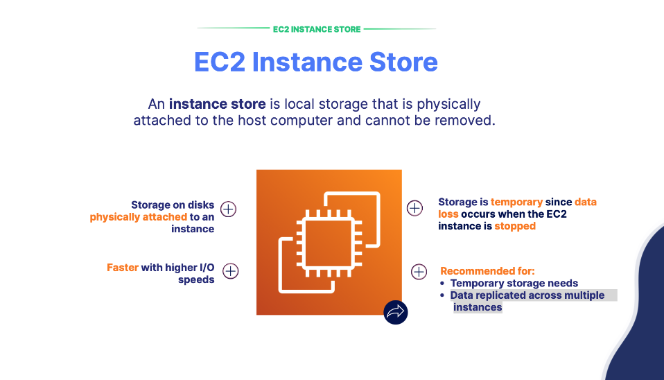An instance store is local storage that is physically attached to the host computer and cannot be removed.