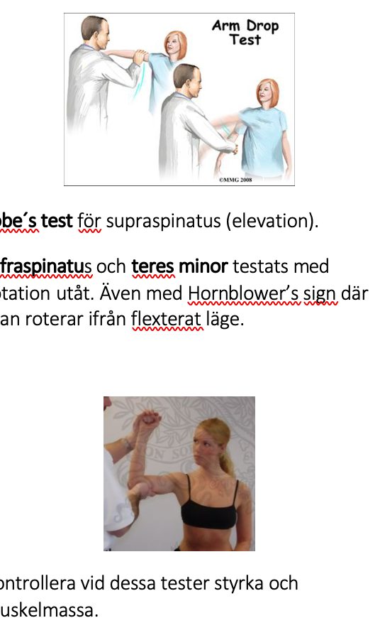 Infraspinatus och teres minor testats med rotation utåt. Även med Hornblower’s sign där man roterar ifrån flexterat läge.