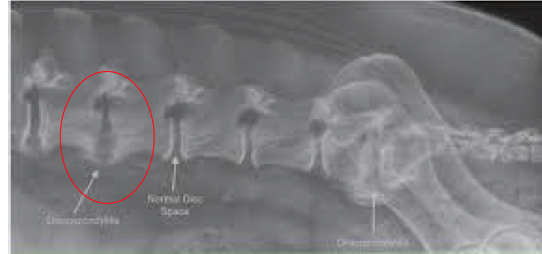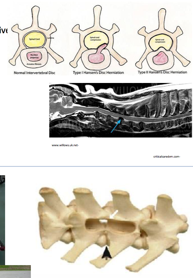 Clinical- will see degeneration of the annulus fibrosus leads to Intervertebral Disc Disease (IVDD). Common in dwarf breeds like doxin, corgi, bulldog.