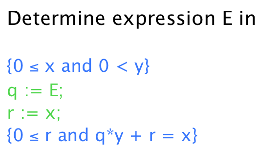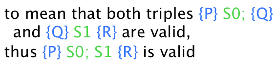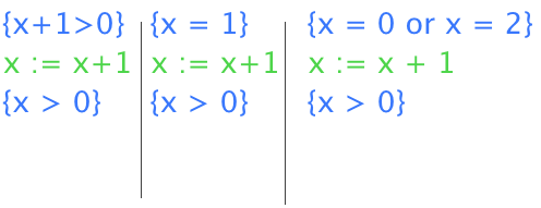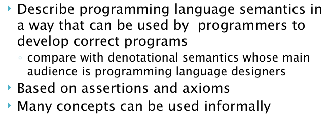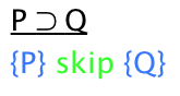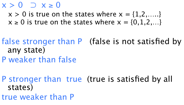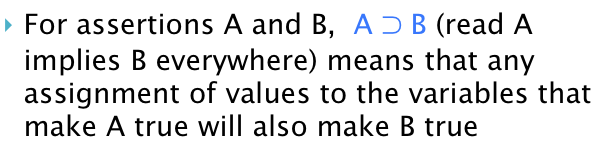 In axiomatic semantics, what notation is used to say that A is stronger then B, and B is weaker than A.