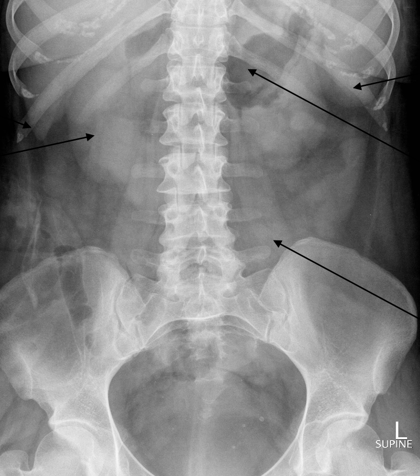 If bowel perforation is considered, which imaging would be useful?