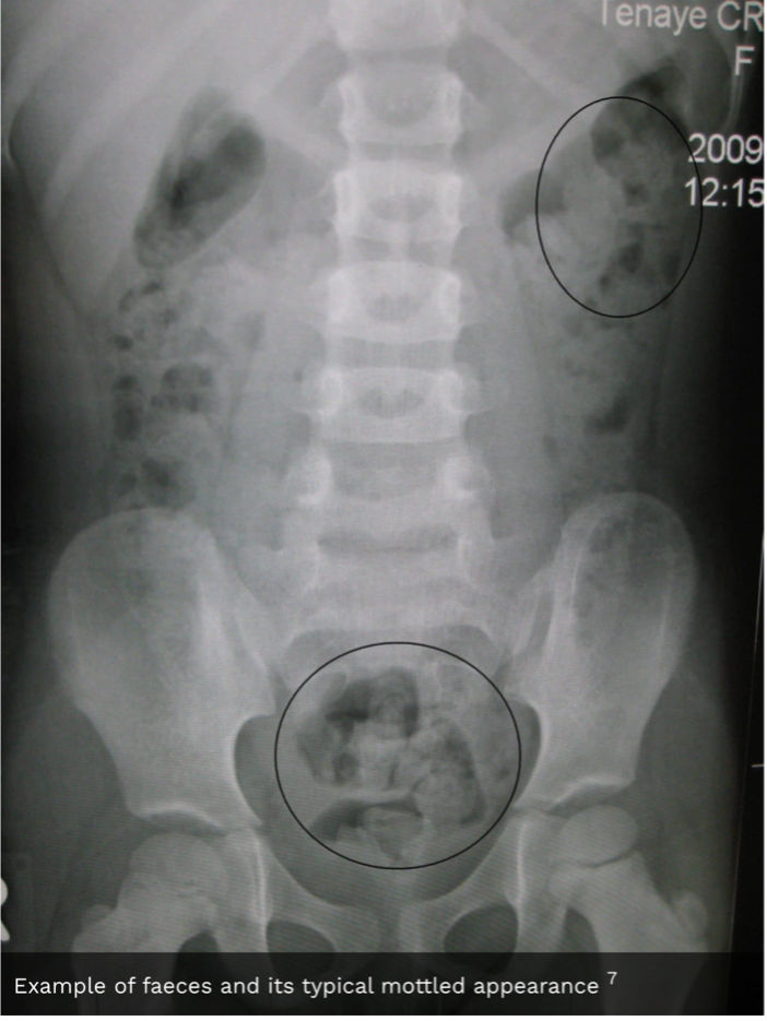 Faeces have a mottled appearance due to trapped gas in colon.