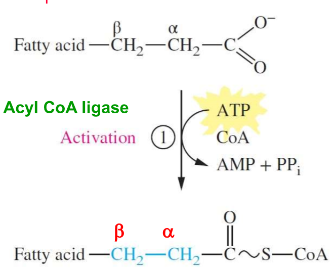 -The fatty acid is added onto Coenzyme A resulting in a high energy thioester bond to the Fatty acid