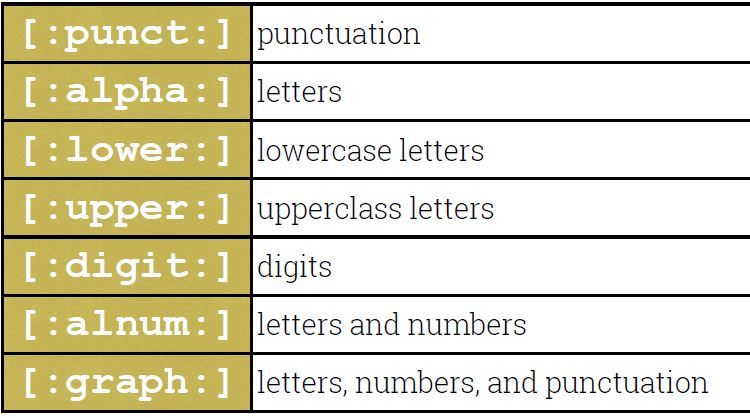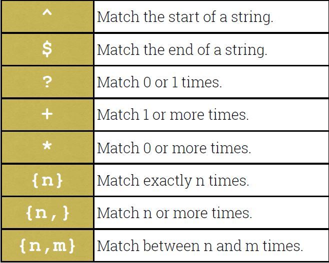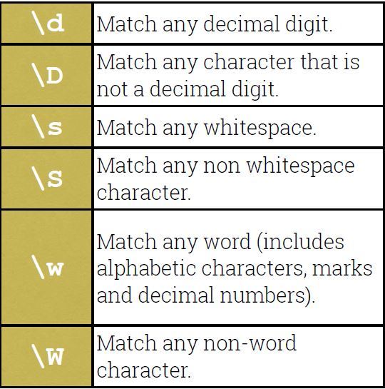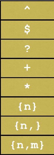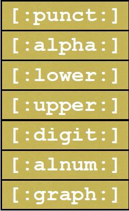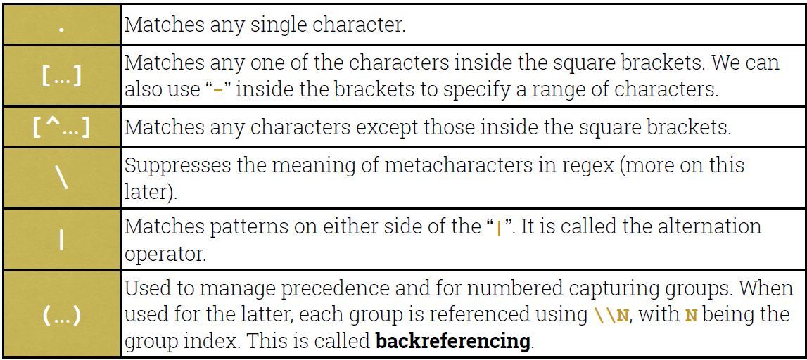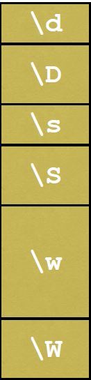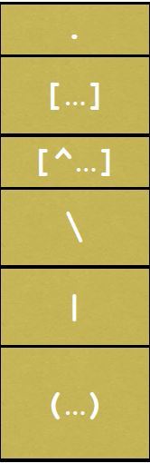 1.Operators. 2.Escape sequences. 3.Anchors and repetitions. 4.Character classes.