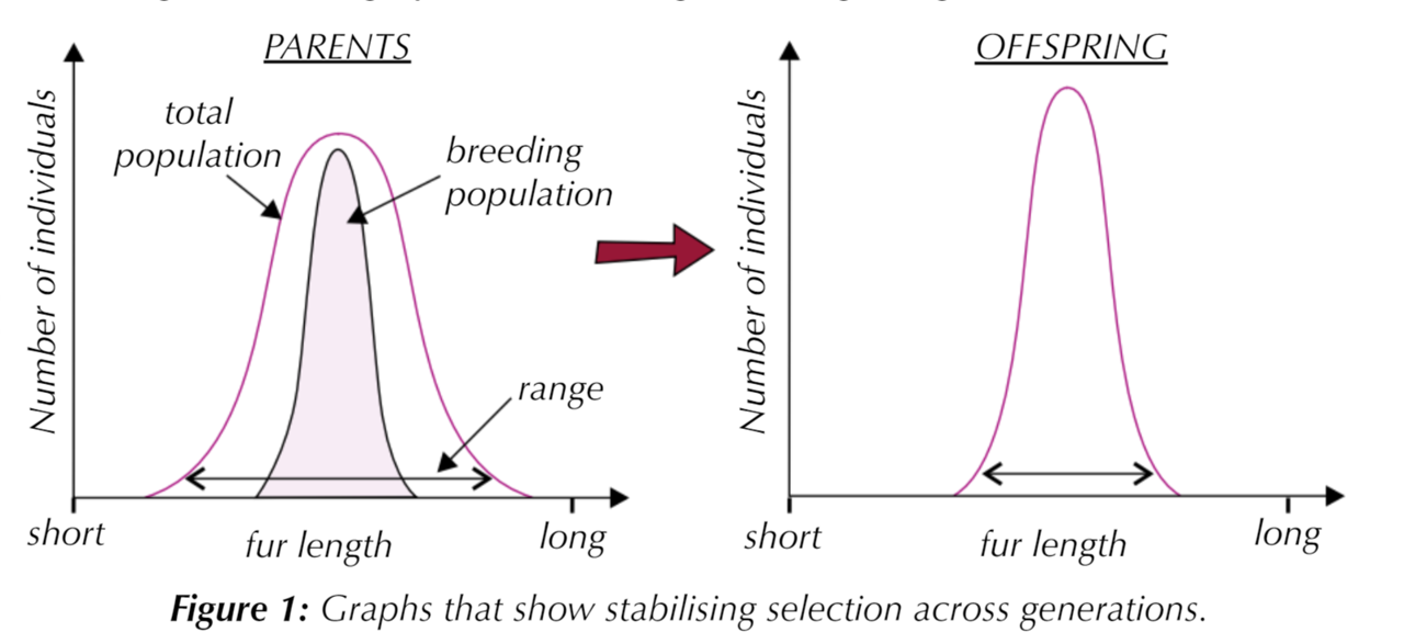 Over time, the proportion of the population with average fur length increases and the range of fur lengths decreases - as shown in Figure 1. In the offspring graph the range of fur lengths has decreased, which results in a narrower graph. The proportion with average length fur has increased, resulting in a taller graph in the average fur length region.
