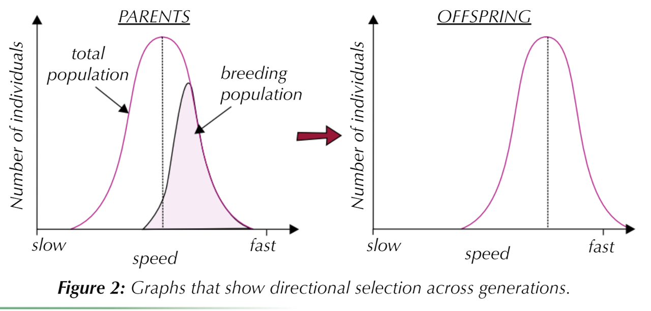 Cheetahs are the fastest animals on land. It’s likely that this characteristic was developed through directional selection, as individuals that have alleles for increased speed are more likely to catch prey than slower individuals, meaning they’re more likely to survive, reproduce and pass on their alleles.