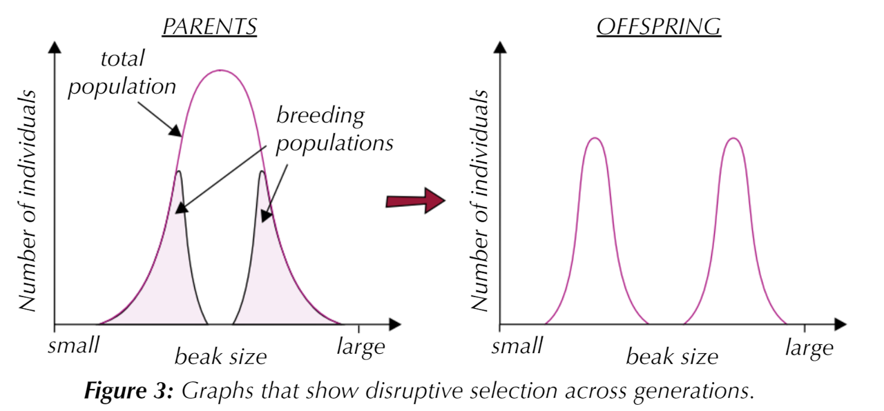 Over time, the alleles for a large beak and a small beak increase in frequency, but the alleles for a medium-sized beak decrease in frequency. The proportion of the population that have either small or large beaks increases - as shown in Figure 3.