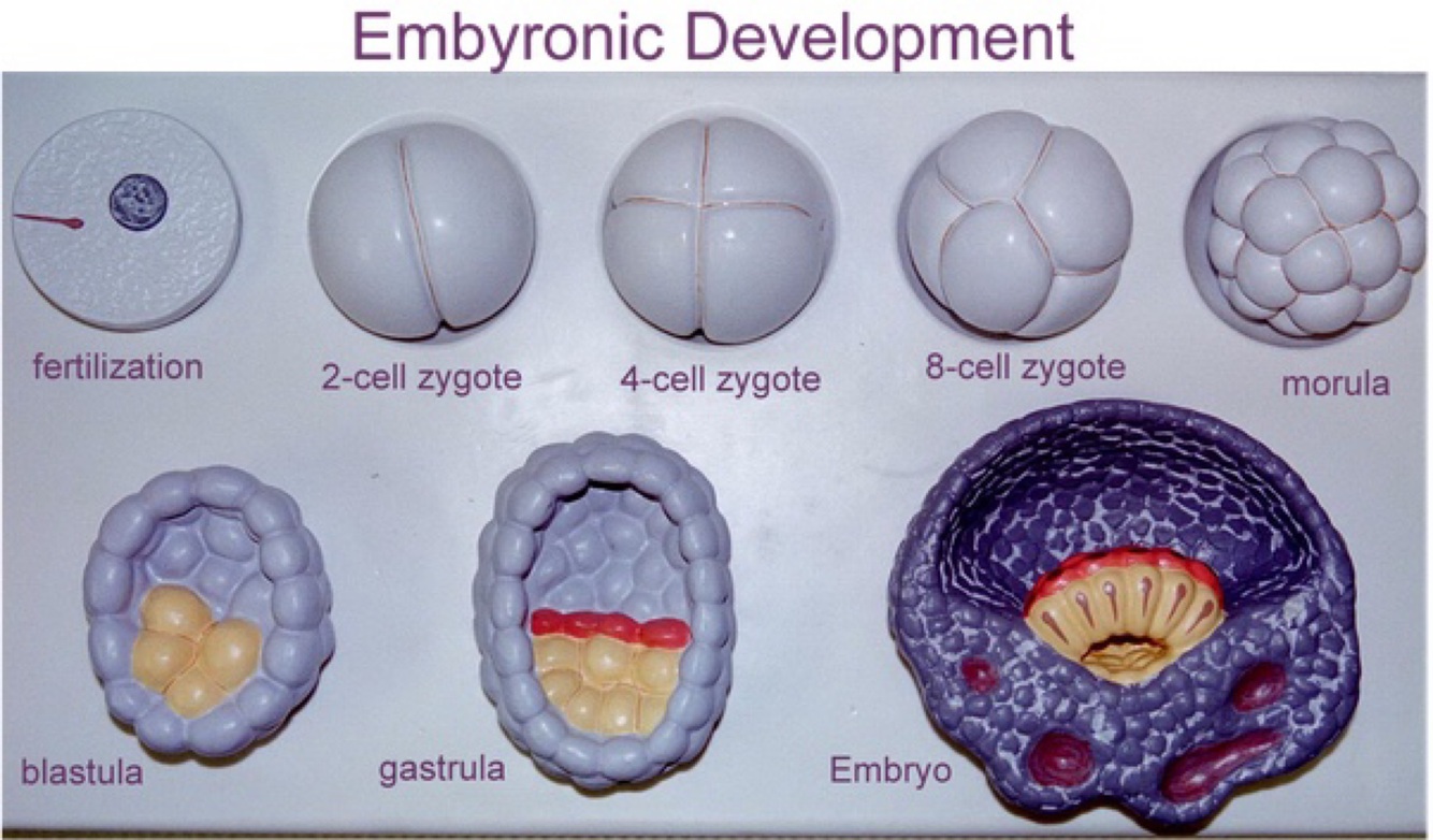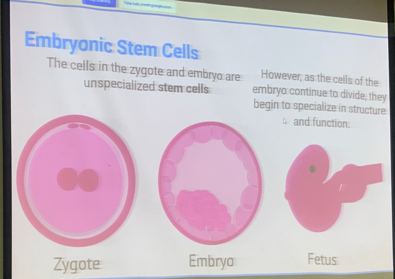 The cells in zygote and embryo are unspecialized stem cells called ”embryonic stem cells” However, as the cells of the embryo continue to divide, they begin to specialize in structure and function.