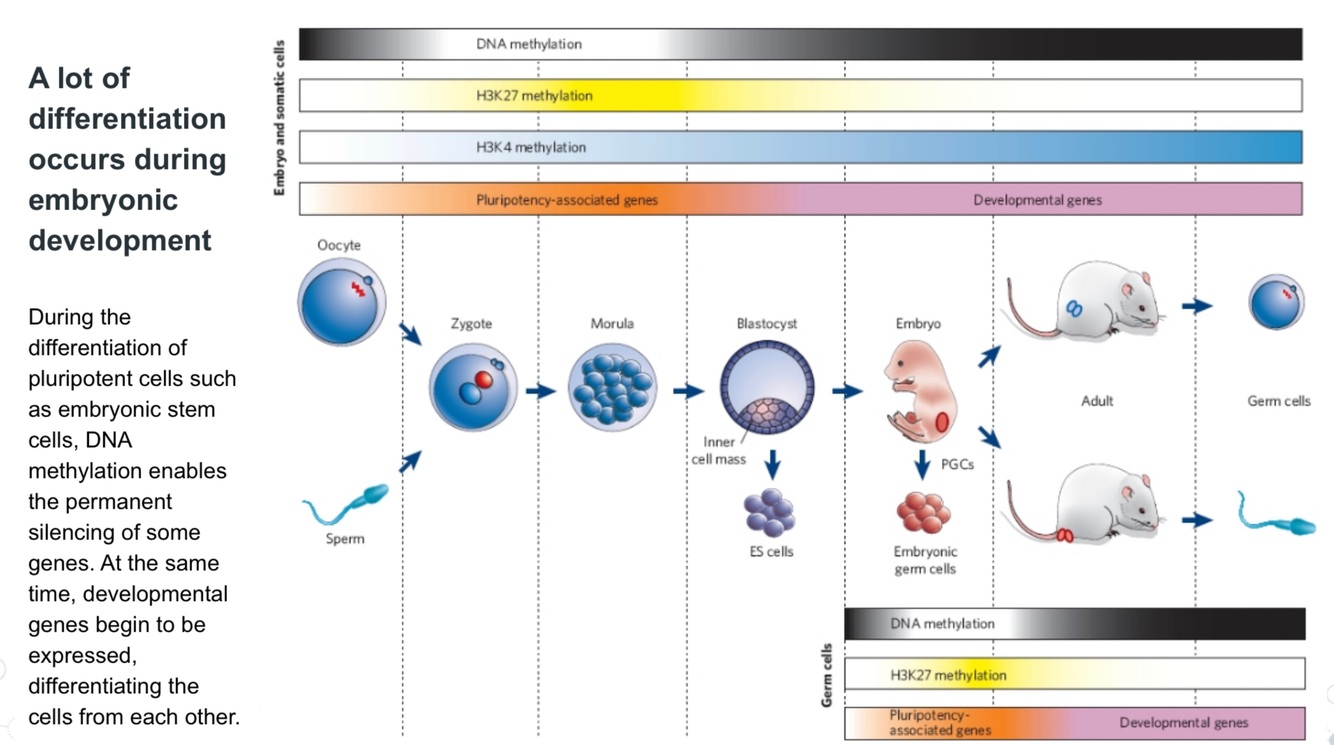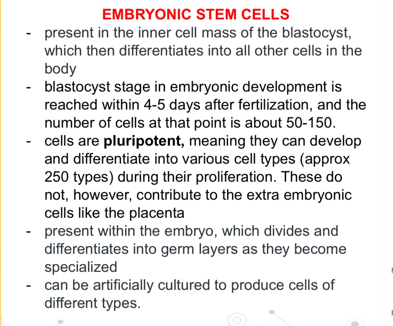 Explain which stages of embryonic development embryonic stem cells are found and when they become differentiated