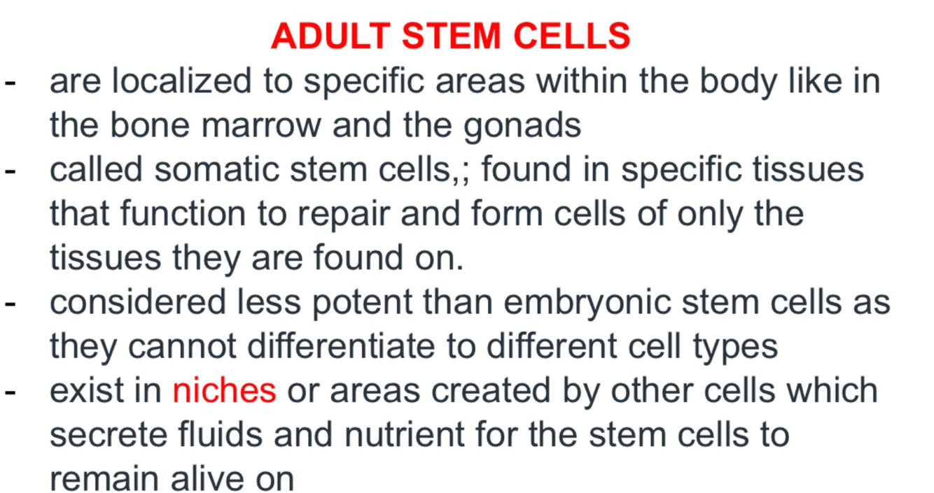 - Why are they there?: It provides the microenvironment with conditions needed for stem cells to remain inactive (not carrying out a specific function) and undifferentiated for a long time and for it to proliferate when needed (e.g. bone marrow, skin and liver)