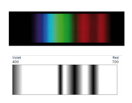 Three roughly, evenly spaced bands in the blue around 453nm. 473nm. and 493 nm.