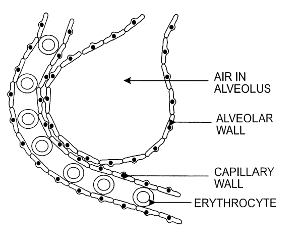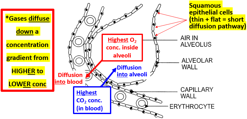 Label three squamous epithelial cells and then show the direction of diffusion of oxygen and the direction of diffusion of carbon dioxide. Indicate where O2 concentration is initially highest and where CO2 concentration is initially highest.