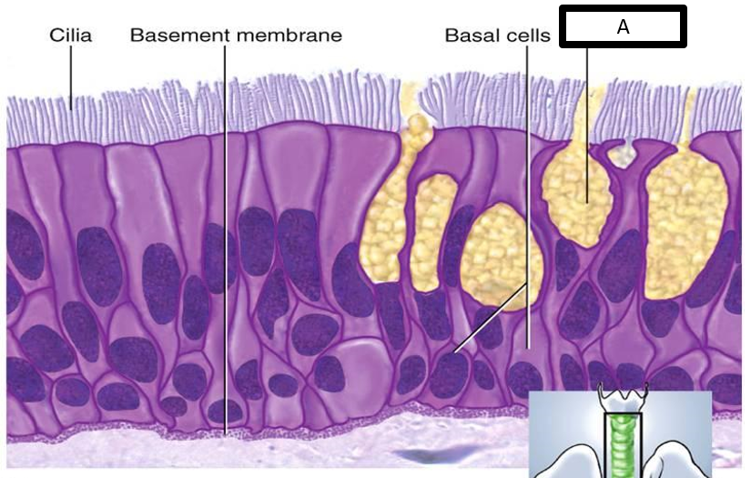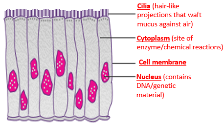 The cilia produce rhythmic ‘rapid wave like motions’ to move mucus and trap pathogens (and unwanted particles), moving against air flow stopping them reaching the alveoli