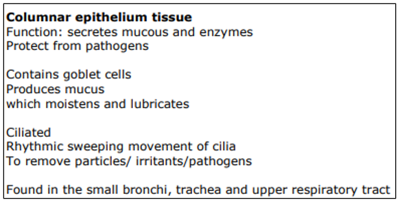 Explain how the structure of the columnar epithelial tissue supports its function in the lungs.