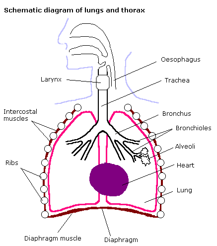 The air travels down the trachea (windpipe), which splits into two tubes called ‘bronchi’, one going to each lung. The bronchi split into progressively smaller tubes called bronchioles, which end at small bags in the lungs called alveoli, where gas exchange takes place.