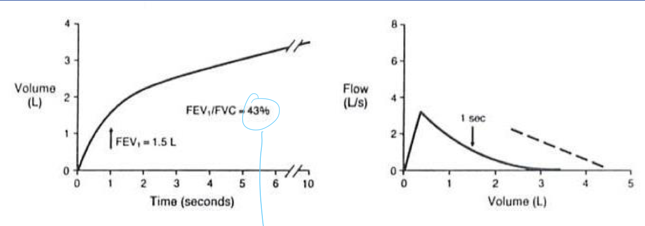 a disporportionate reduction of maximal airflow from the lung with respect to the maximal volume (FVC) that can be displaced from the lung. Indicates expiratory airlow limitation