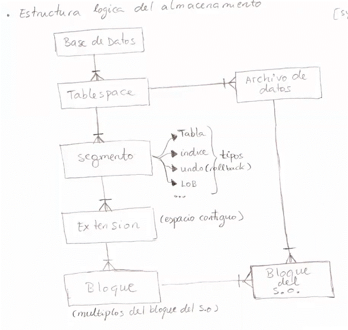 En cuanto a la estructura lógica de almacenamiento en Oracle, qué elementos hay, de arriba a abajo?