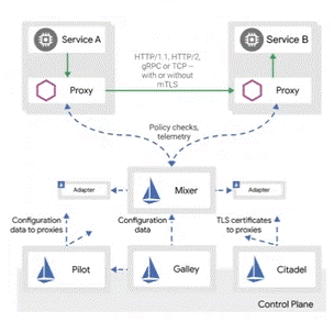 Service Mesh -> Tecnología para abordar las complejidades de las arquitecturas de microservicios, que ya no tienen que hacerla los microservicios (plano de control). En los microservicios se incluye un Proxy que se comunica con el Service Mesh
