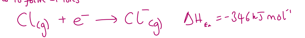 enthalpy change when one electron is added to one mole of gaseous atoms to form -1 ions