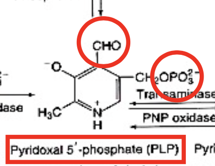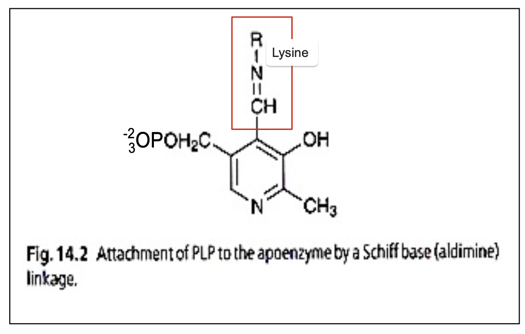 * The carbonyl group of the PLP has a double bond with nitrogen atom of the amino group of a lysine residue on the enzyme