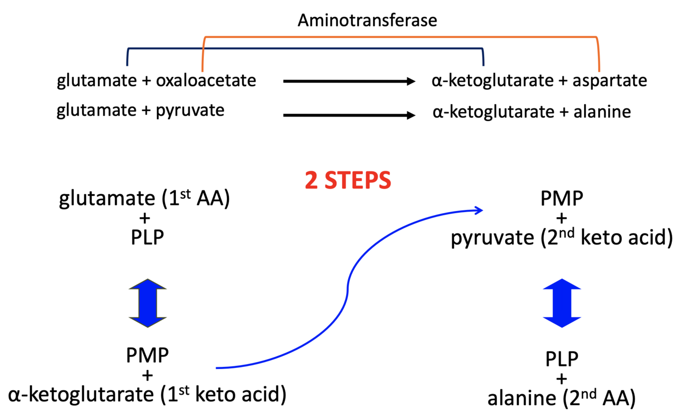 PLP bound to the transaminase enzyme is what does all the action, so the amine group being donated from the AA binds first to the PLP at the active site and is then donated to the keto acid to form a new AA.