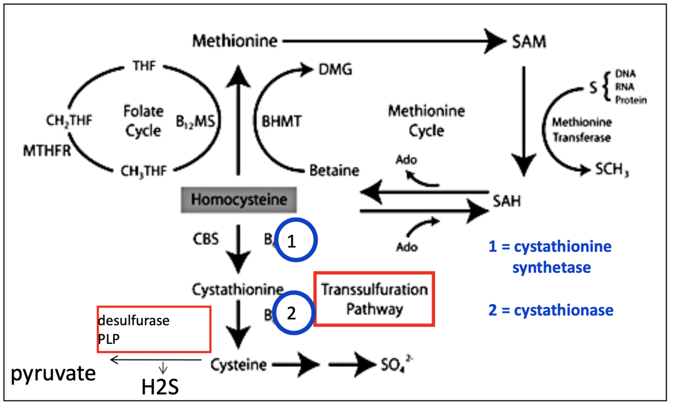 * trans-: Conversion of homocystein to cysteine requires PLP