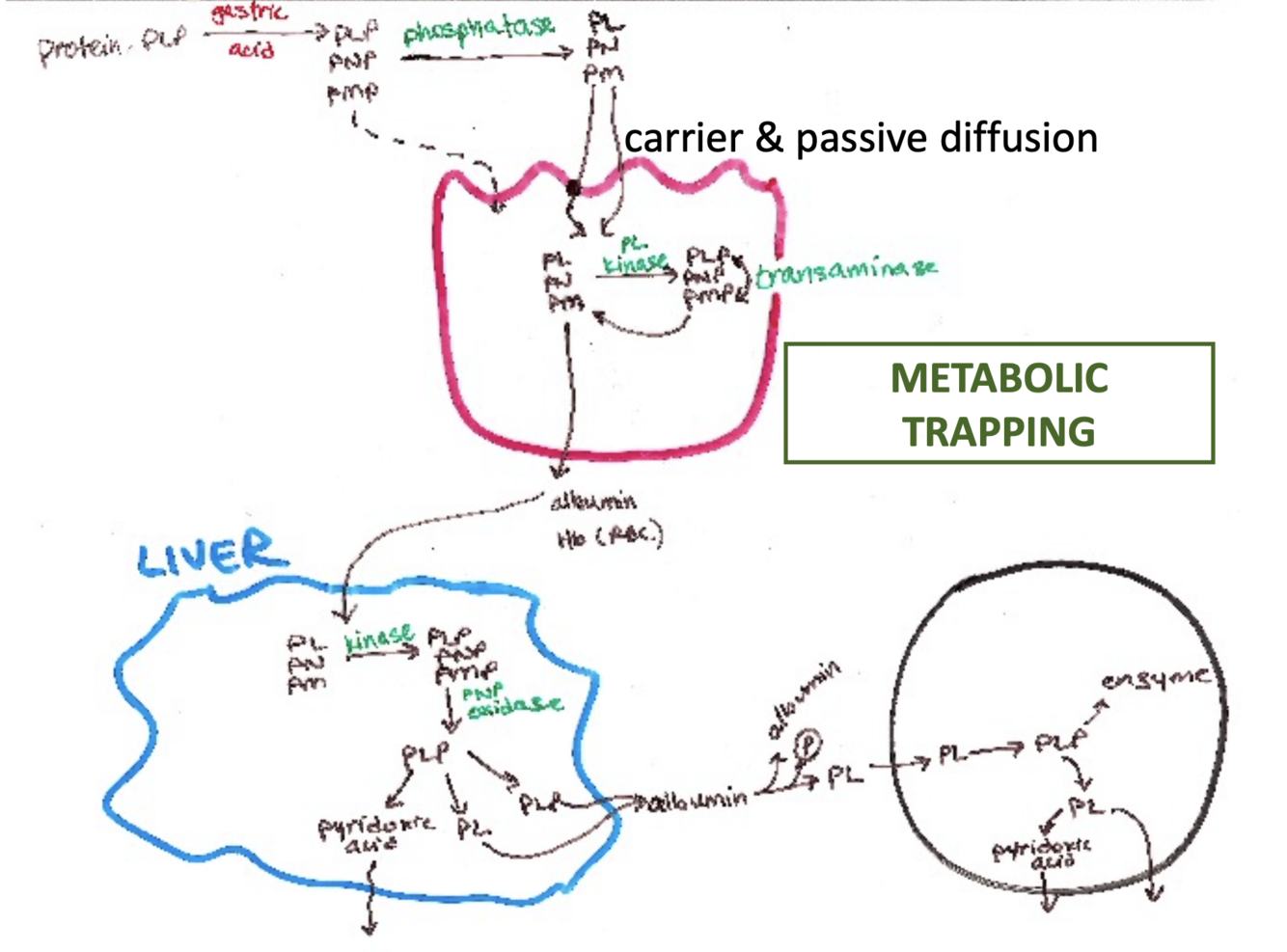 Breakdown of ingested proteins via gastric acid releases PLP which is then dephosphorylated via phosphatases down to the vitaminer and then transported into enterocyte via carrier & passive diffusion. Some will be converted back to PLP via PL kinases, transaminase, PNP oxdase in enterocyte to be used but most will be transported to circulation and transported bound to albumin. Goes to liver first and be converted to active PLP where some PLP is converted to pyridoxic acid (useless) and is excreted and some PL/PLP goes to other tissue (via albumin bound). Enters tissue as PL, is converted to PLP where some binds to enzyme, some is excreted as the acid and some may leave as PL to go other places.
