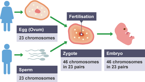 Fertilisation is the fusion of the nucleus of a male gamete with the nucleus of a female gamete. In humans, each gamete has half the number of the total 46 chromosomes that the body requires. 23 chromosomes within a gamete are referred to as a haploid. When the two gametes combine, they merge the two sets of chromosome to have 46, which are referred to as diploid.