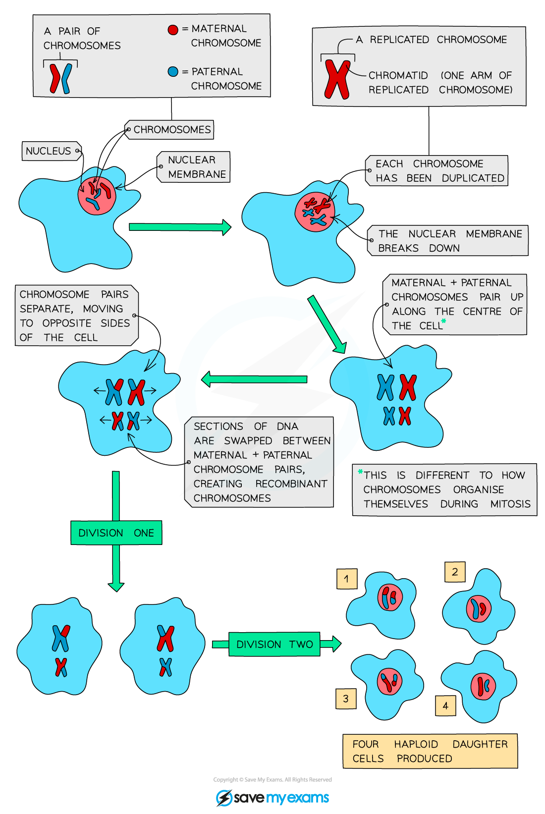 Sexual reproduction uses the process of meiosis, which creates gametes. The process of meiosis happens in the male and female reproductive organs. As a cell divides to form gametes:
