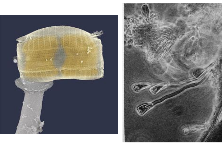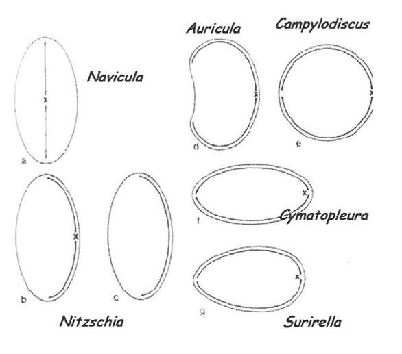 Most centric and Araphidean pennate diatoms have a RIMOPORTULA, a special wall organelle, represented by more or less elongate tube passing through the valve, which in the internal side of the valve shows an opening similar to two lips.