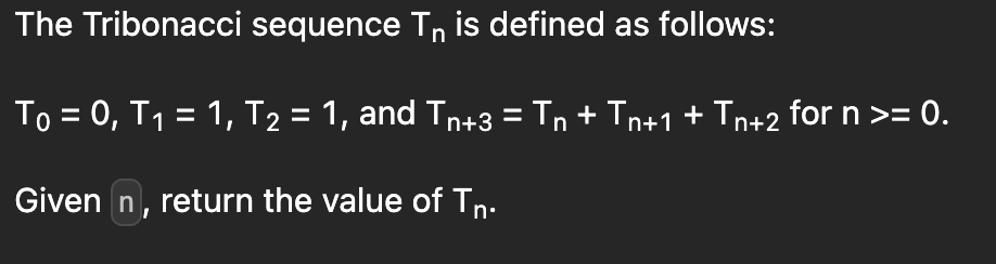 dp to store the value of computed tribonacci numbers, initialized with the base cases dp[0] = 0, dp[1] = 1, dp[2] = 1.dfs(i) be the value of ithi is in dp, return dp[i].dfs(i - 1) + dfs(i - 2) + dfs(i - 3) and set dp[i] = answer. Then return answer.dfs(n).Tribonnaci Top Down Aproach