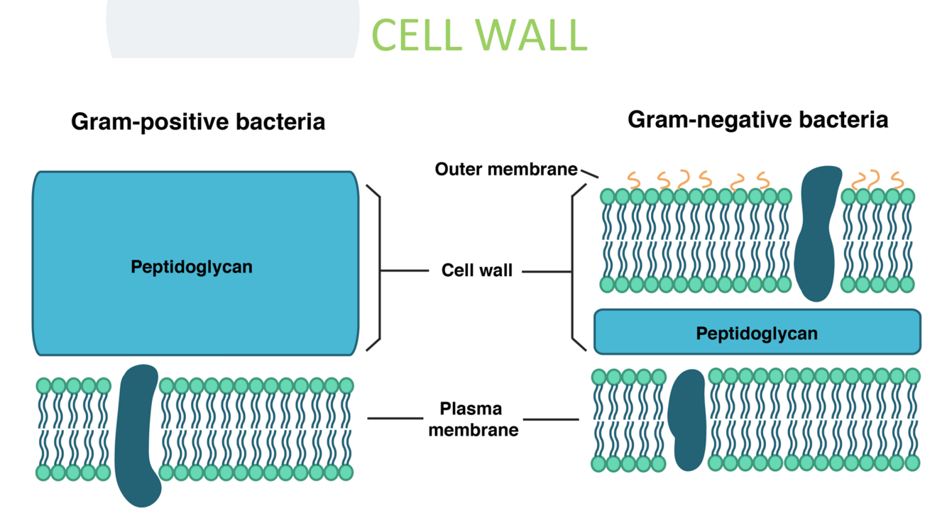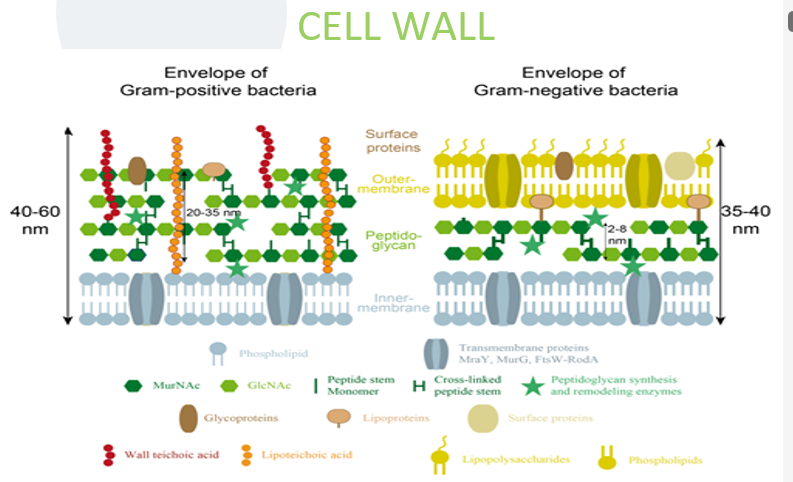 Outer layer present in bacteria, mainly composed of peptidoglycan but also: