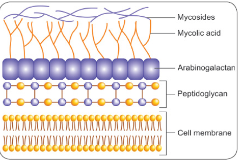 Outer lipid layer – primarily composed of mycolic acids (long chained fatty acids, covalently linked to arabinogalactan)
